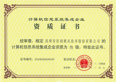 2010年11月,經(jīng)過一系列嚴格的審核,佳創(chuàng)視訊通過計算機信息系統(tǒng)集成資質(zhì)認證,被工信部授予“計算機信息系統(tǒng)集成企業(yè)資質(zhì)”三級證書。